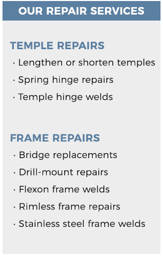 Our business was started by a licensed optician. Our original owner’s 60+ years of experience, extensive research and ample knowledge in the optical industry has translated into groundbreaking technology and a quality level of repair for your glasses, frames and sunglasses. If it is broken, we can fix it!